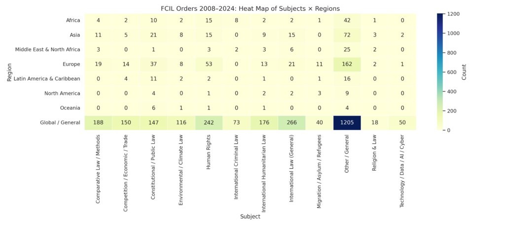 A quick look at the heat map makes the pattern easy to spot. Our strongest coverage clusters around Europe and “Global/General” materials, especially in human rights, constitutional law, and international law. By contrast, parts of Africa and Asia show lighter coverage across several subject areas. Seeing the collection mapped out like this helped pinpoint where it’s robust—and where we could build depth.