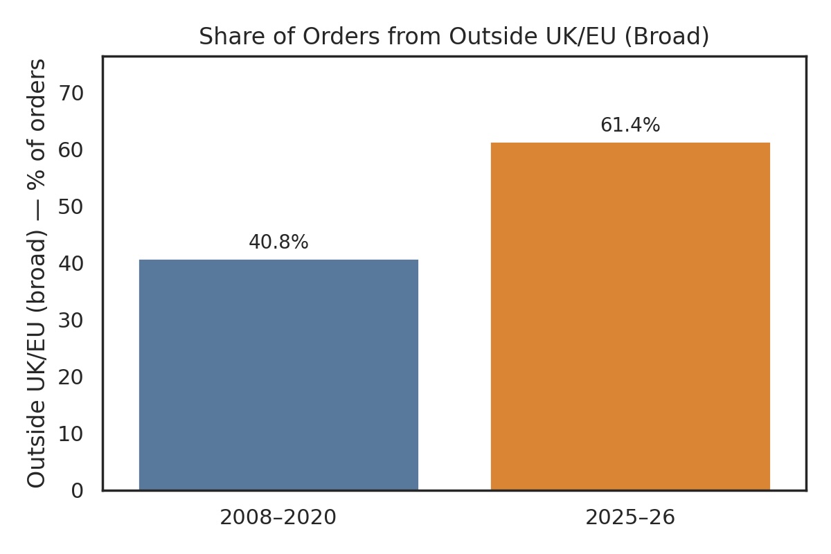 Another comparison reveals a broader trend: where 40.8% of our FCIL orders came from outside the UK and EU before 2020, that share has jumped to 61.4% for 2025–26. In other words, a majority of our recent acquisitions now come from jurisdictions beyond our traditional core.